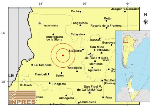 Epicentro: 175 km al O de San Miguel De Tucumán; 207 km al NO de San F. Del Valle De Catamarca; 80 km al N de Belén -26.931 (lat) -66.959 (long)