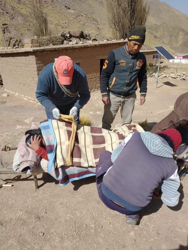 Ante esta situación, un grupo de pobladores decidió su traslado en una improvisada camilla confeccionada con hierros, un colchón y frazadas.