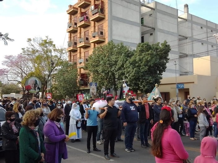 En horas de la tarde, una gran cantidad de fieles y devotos, familias de la catequesis del ámbito parroquial, alumnos y docentes de los colegios Juan Pablo II, Santa Rosa de Lima y Cristo Rey, se congregaron en la plaza Virgen del Valle, desde donde partió la caminata con la imagen de Santa Rosa de Lima y la imagen peregrina de Nuestra Señora del Valle, acompañadas de cerca por el párroco y el vicario parroquial, presbíteros Marcelo Amaya y Eduardo Navarro, respectivamente.