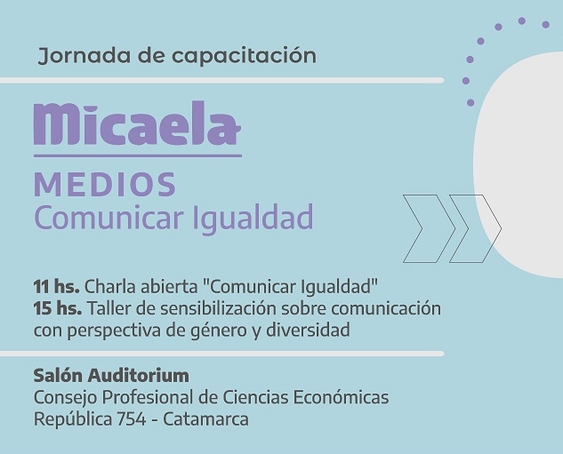 Seguidamente y a partir de las 15 hs, se dará inicio a la Capacitación “Micaela Medios – Comunicar Igualdad”, destinada a periodistas, comunicadores y equipos institucionales de comunicación y trabajadores de prensa independientes de toda la provincia. Tendrá modalidad mixta, presencial para los inscriptos residentes en el Valle Central, y virtual para el interior provincial.
