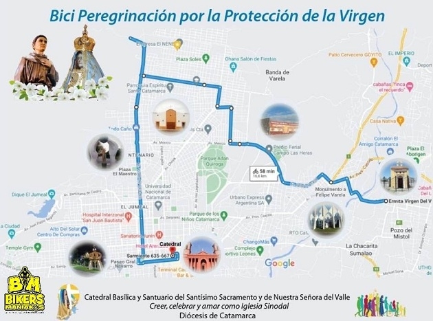 La travesía abarcará una distancia de 16 kilómetros y el recorrido comprenderá el Camino de la Virgen, pasando por el badén sobre el río del Valle, Av. 34 Juan Carrizo, Av. Presidente Castillo, rotonda del Monumento a Felipe Varela, Gdor. Emilio Castro, Av. Ramón Recalde; en el Estadio Bicentenario habrá una parada por reagrupamiento, continuando por Av. México, Av. República Argentina, rotonda de la Av. Choya, continuando por éste hasta Av. Los Terebintos, Av. Virgen del Valle hacia el norte.