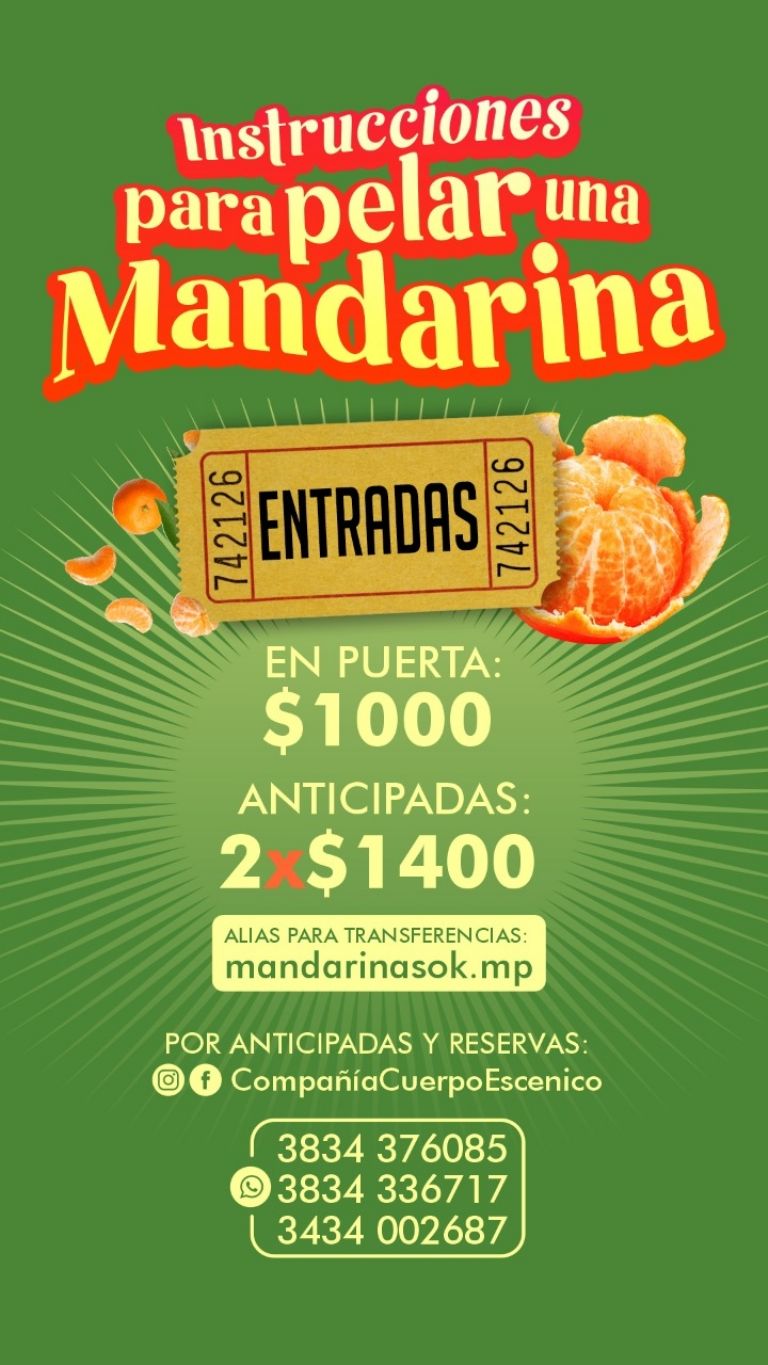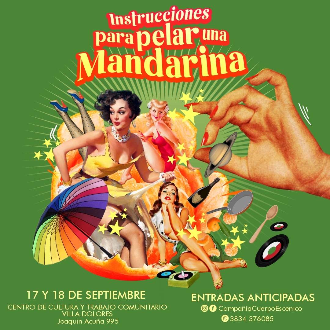 Este sábado se llevará a cabo el estreno de la obra “Instrucciones para pelar una mandarina”, de la Compañía Cuerpoescénico. El encuentro se dará en la sala Fábrica de Utopías del Centro de Cultura y Trabajo Comunitario de Villa Dolores, Valle Viejo, y volverá a presentarse el domingo 18, a las 21:30 hs.