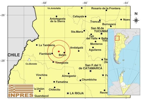Epicentro: 179 km al NO de San F. Del Valle De Catamarca; 205 km al N de La Rioja; 27 km al O de Belén -27.603 (lat) -67.291 (long)
