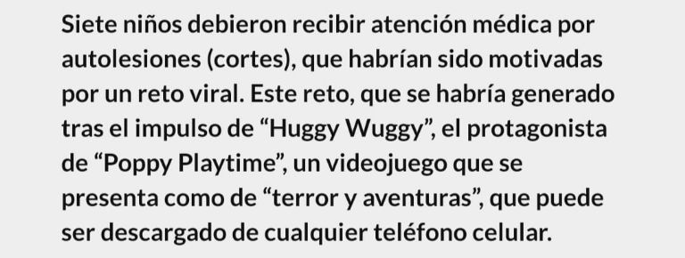 Si bien, en la versión original no hay nada referido a las autolesiones, su enorme popularidad sobre todo en el grupo de niños que abarca los 6 y 10 años, empujó a que existan copias (spin-offs) que toman algunos elementos y escapan del control de los creadores de “Poppy Playtime”. En estas copias, que circulan en diferentes plataformas, se encontró material que incita a autolesiones y a otras conductas de riesgo mediante “retos” propuestos a los chicos.