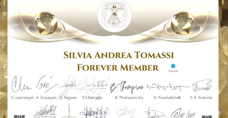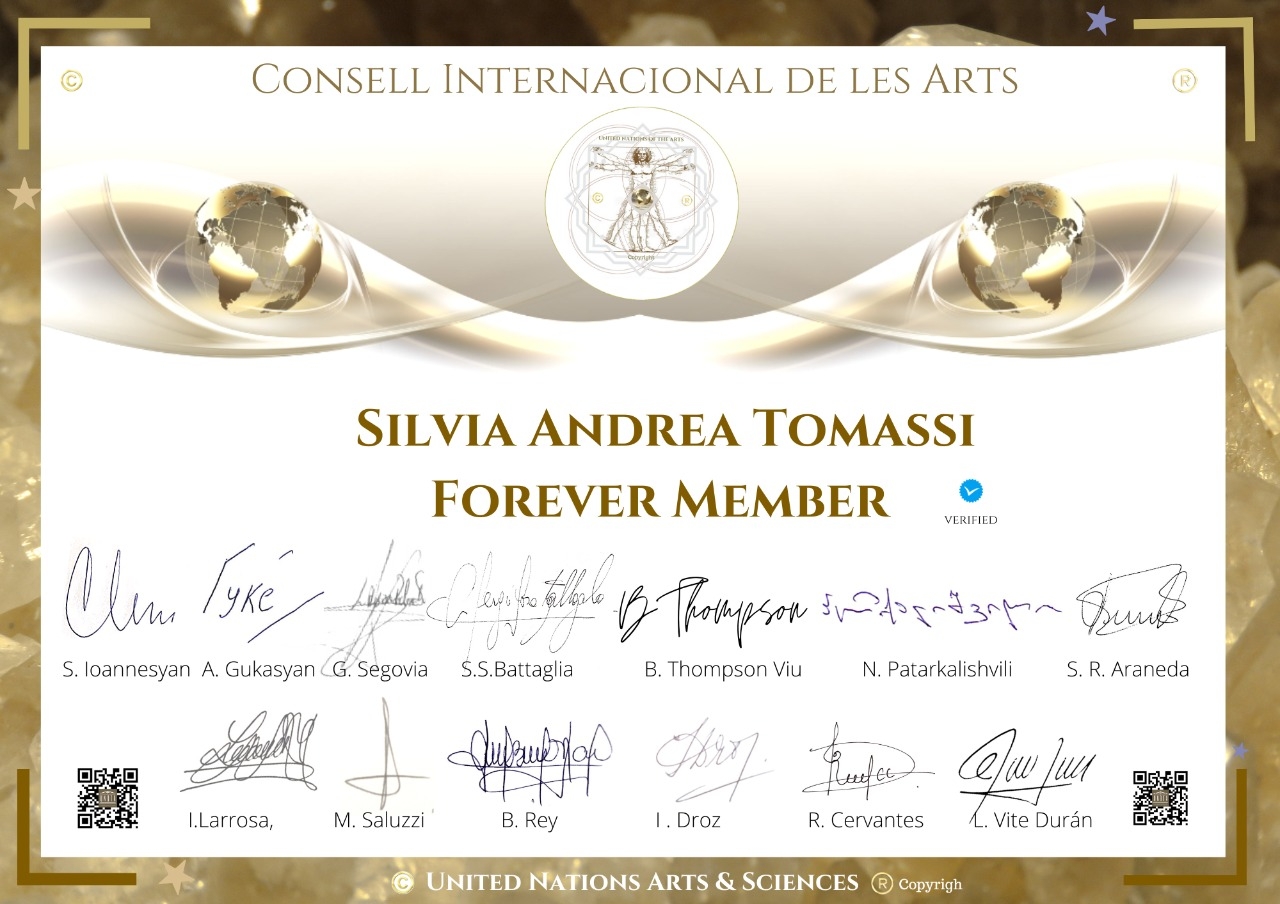 En la oportunidad Tomassi recibió el Certificado de Naciones Unidas de las Artes & Ciencias (matricula n°70045) en la que se la designa como miembro permanente de la prestigiosa institución y en reconocimiento por su labor como creativa y difusora del arte.
