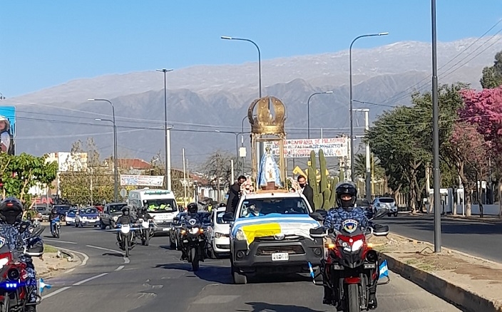 Luego, la Madre Morena partió hacia Piedra Blanca, acompañada por una extensa y entusiasta caravana vehicular, para engalanar la fiesta por el primer año de la ceremonia en que su amado hijo, el Beato Mamerto Esquiú, fue elevado a los altares. En el ingreso a la localidad la esperaban agrupaciones gauchas que la escoltaron hasta la plaza.