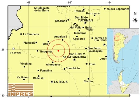 Epicentro: 89 km al NO de San F. Del Valle De Catamarca; 153 km al N de La Rioja; 57 km al S de Andalgalá -28.057 (lat) -66.529 (long)