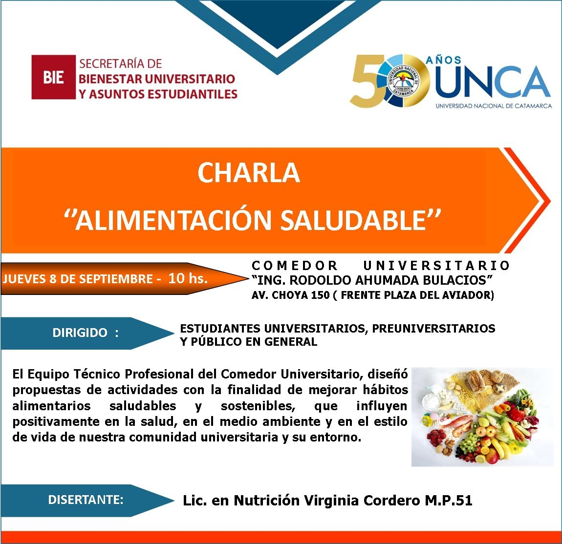En el marco del 50 aniversario de la UNCA, la Secretaría de Bienestar Universitario y Asuntos Estudiantiles organiza la Charla “ALIMENTACIÓN SALUDABLE”, a cargo del Equipo técnico profesional del Comedor Universitario “Ing. Rodolfo Ahumada Bulacios”.