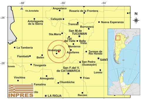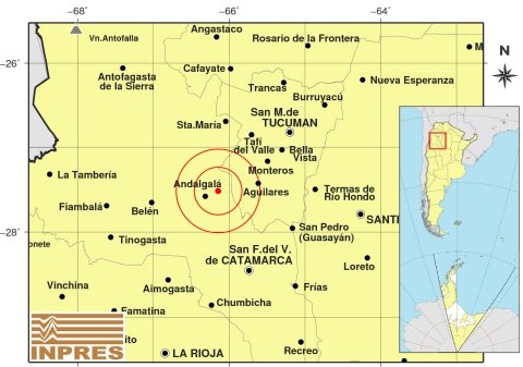 Epicentro: 116 km al NO de San F. Del Valle De Catamarca; 125 km al SO de San Miguel De Tucumán; 14 km al NE de Andalgalá -27.494 (lat) -66.208 (long)