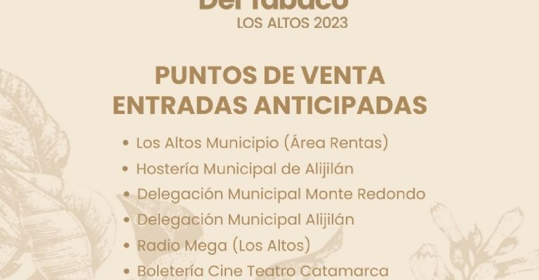 En Capital, las entradas se encuentran disponibles en boletería del Cine Teatro Catamarca. El Festival del Tabaco tiene una impresionante cartelería con las actuaciones de Nicolas Reyna, Los Tekis, y renombrados artistas nacionales y locales.