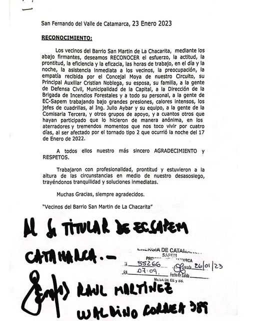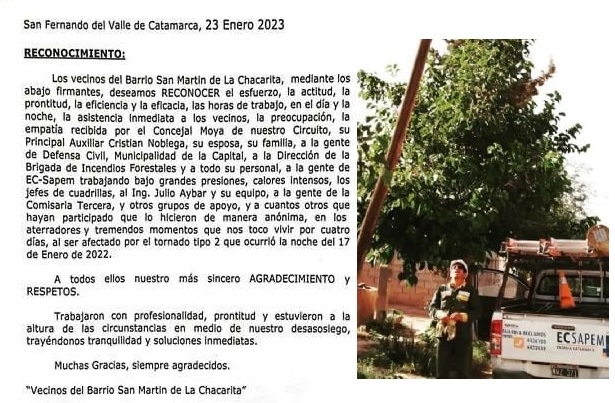 “Mediante una nota, vecinos del Barrio San Martín de La Chacarita nos hicieron llegar su reconocimiento por los trabajos de nuestros operarios en los momentos más difíciles que nos tocó vivir a todos.