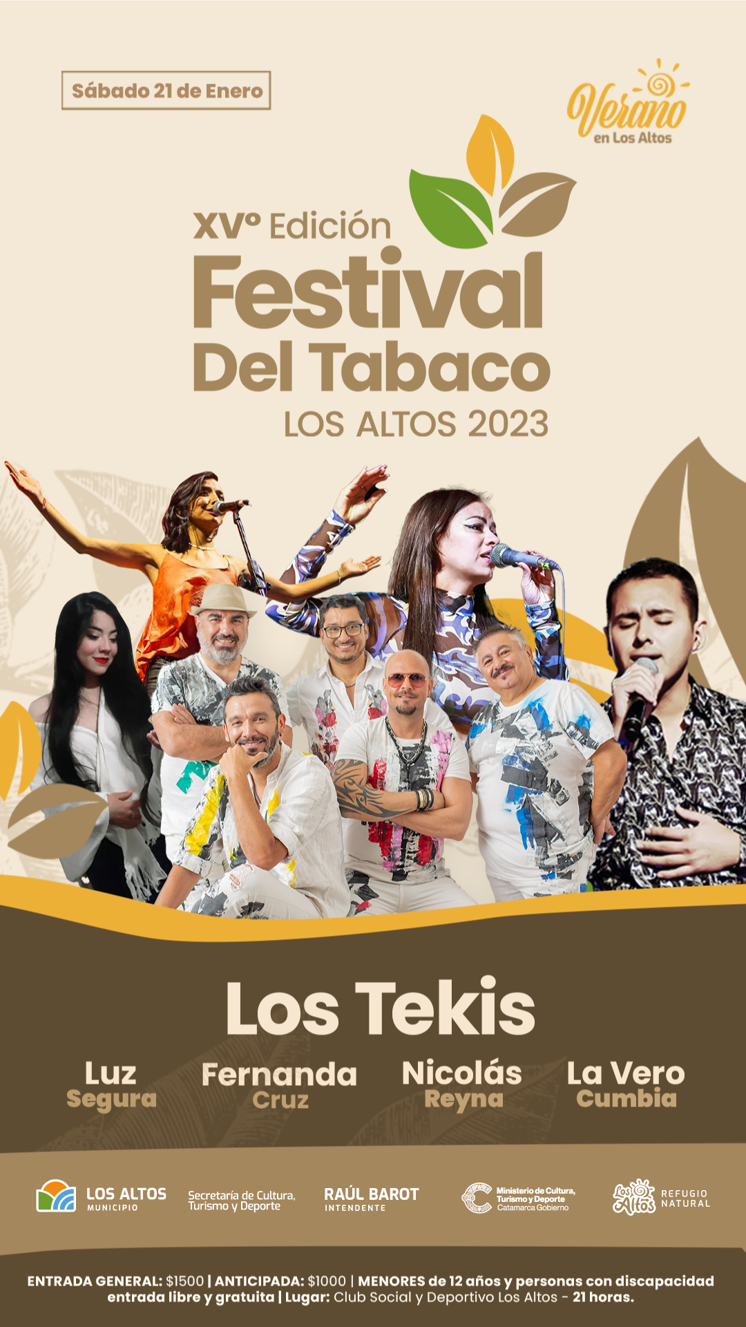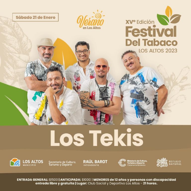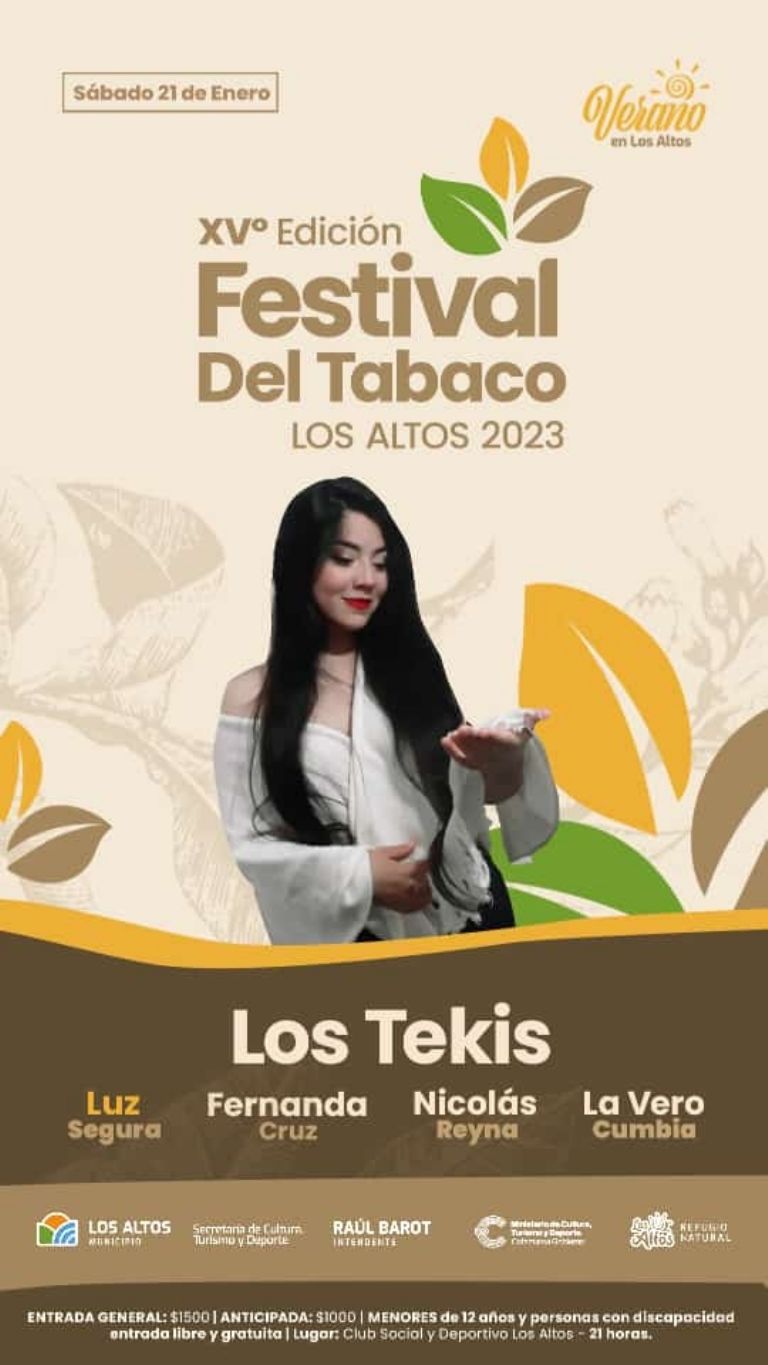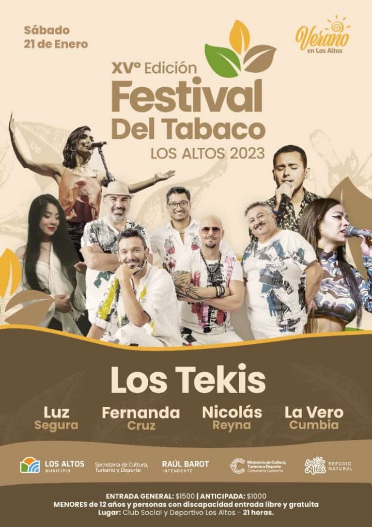 El sábado 21 de Enero se realizará XV Edición del Festival del Tabaco en Los Altos que se viene con una impresionante cartelera que incluye a Los Tekis, a Nicolas Reyna, Luz Segura, Fernanda Cruz, La Vero Cumbia y destacados artistas nacionales y provinciales que se presentarán en el Club Deportivo Los Altos