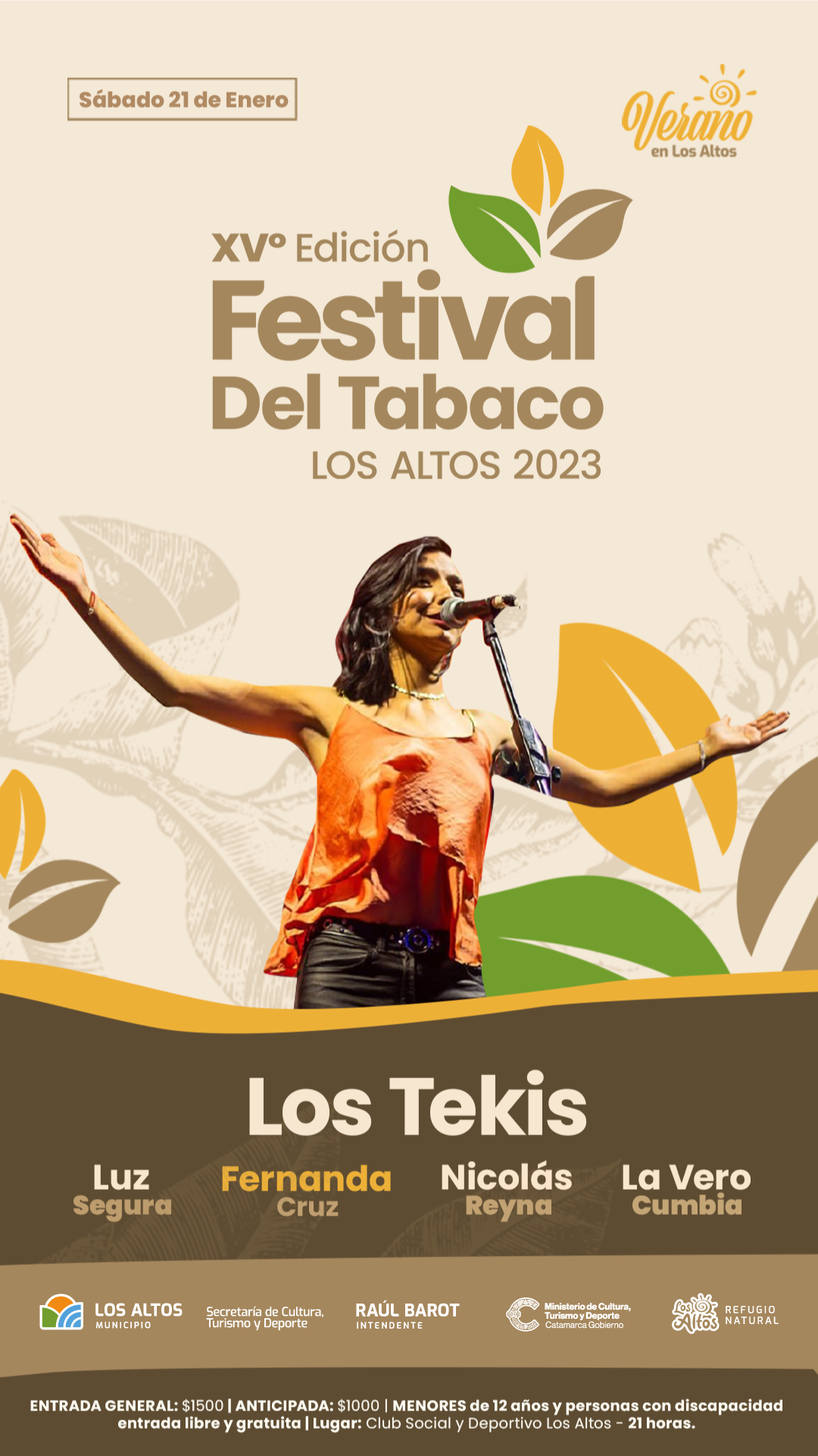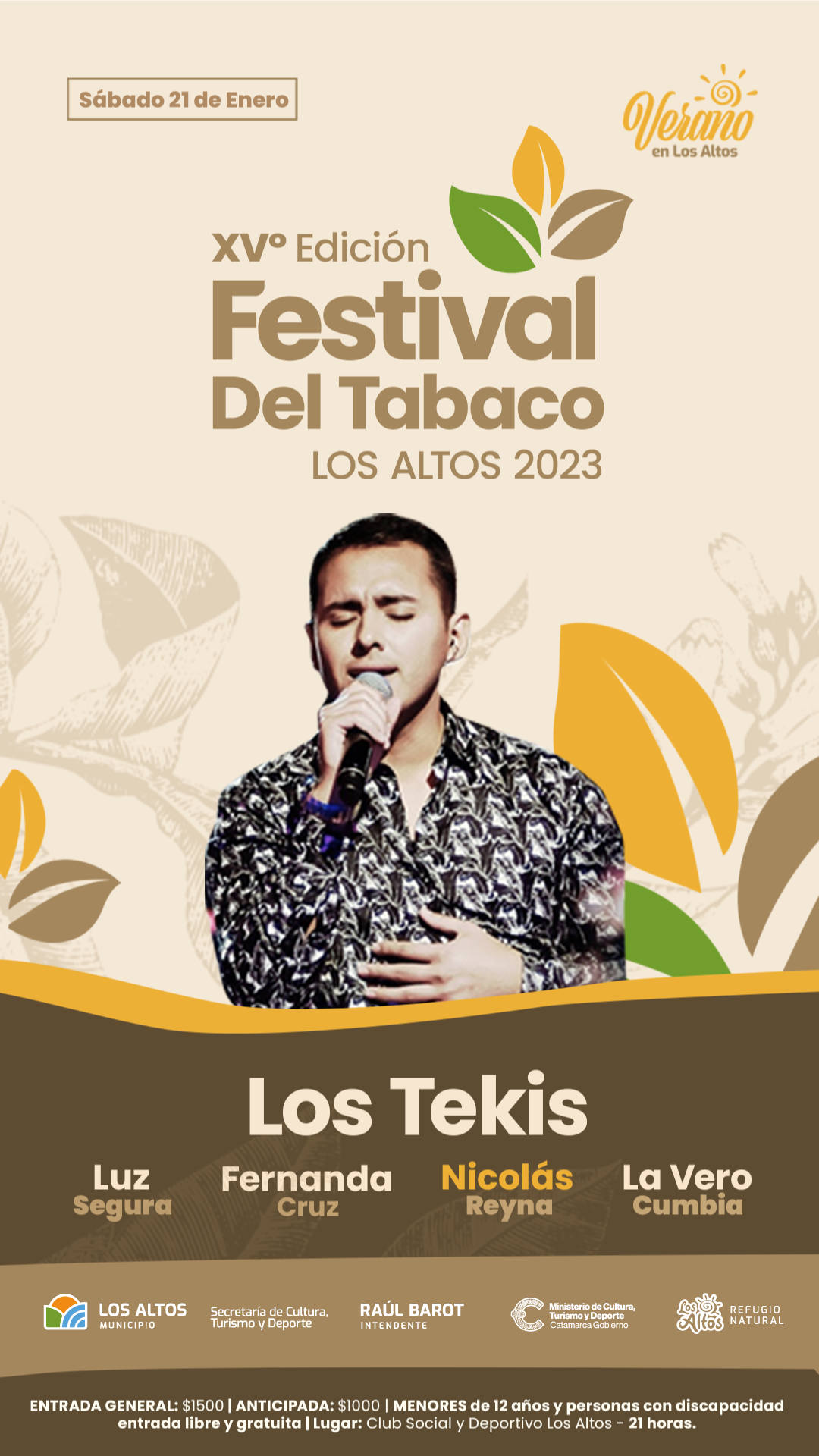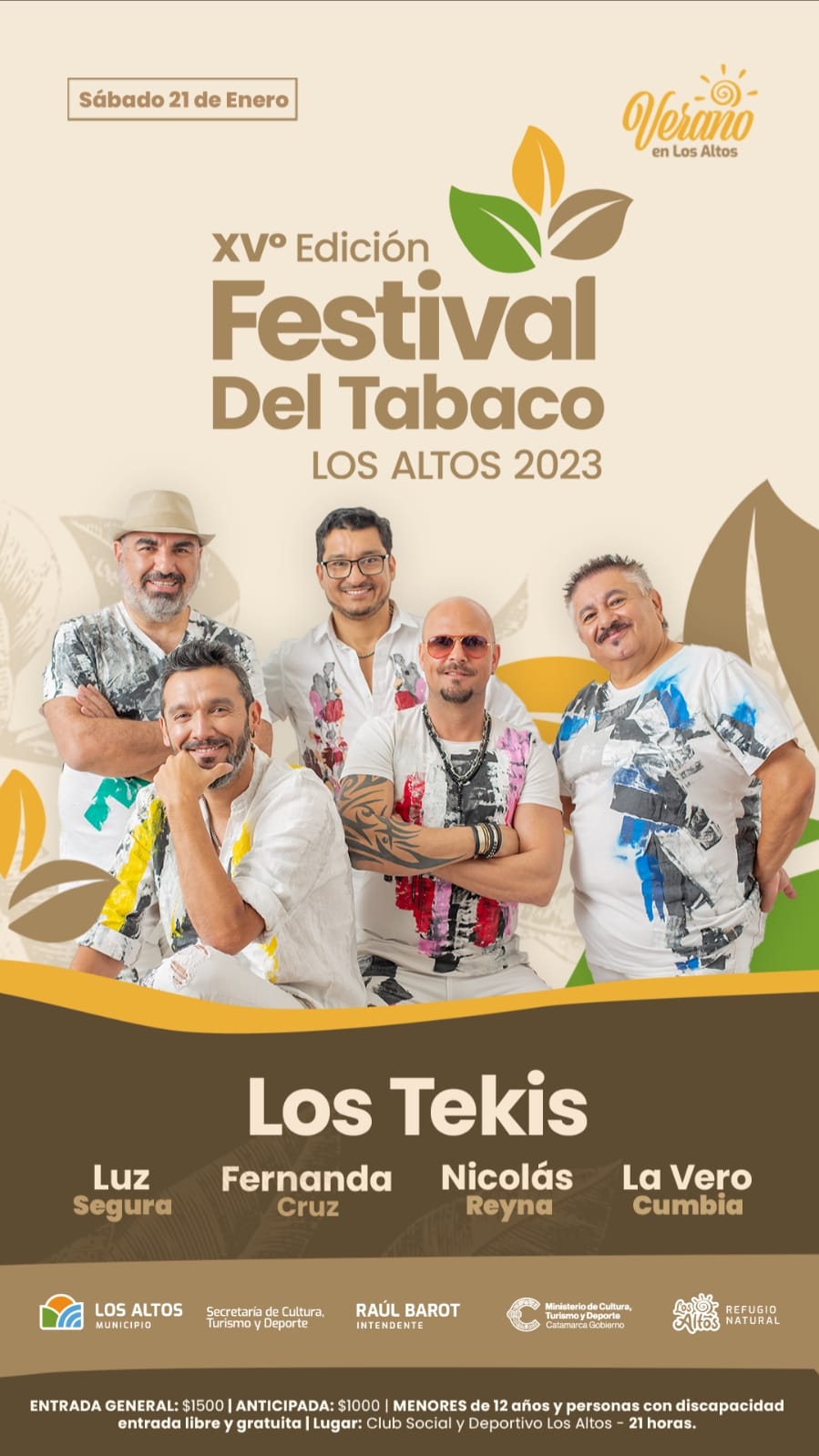 El sábado 21 de Enero se realizará XV Edición del Festival del Tabaco en Los Altos que se viene con una impresionante cartelera que incluye a Los Tekis, a Nicolas Reyna, Luz Segura, Fernanda Cruz, La Vero Cumbia y destacados artistas nacionales y provinciales que se presentarán en el Club Deportivo Los Altos