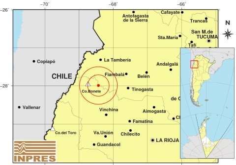 Epicentro: 221 km al NO de La Rioja; 269 km al O de San F. Del Valle De Catamarca; 75 km al S de La Tambería -27.994 (lat) -68.433 (long)