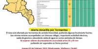 El área se verá afectada por Tormentas de Variada Intensidad, pudiendo ser algunas locamente fuertes, acompañadas por ráfagas de viento intenso, importante actividad eléctrica, caída de granizo, y abundante caída de agua en cortos período de tiempo.