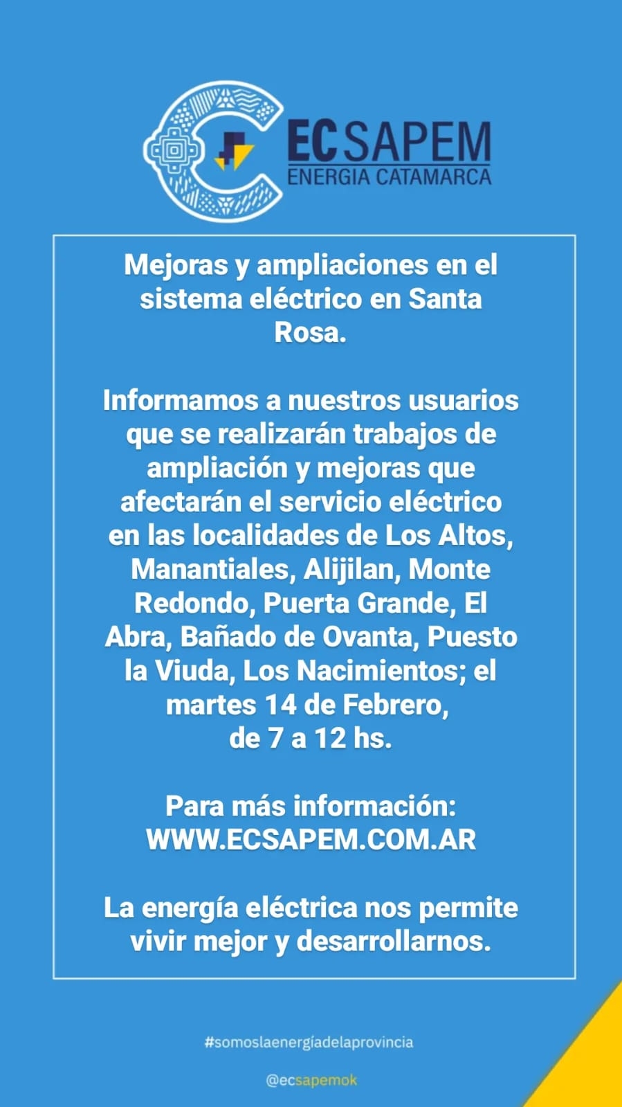 Informamos a nuestros usuarios que se realizarán trabajos de ampliación y mejoras que afectarán el servicio eléctrico en las localidades de Los Altos, Manantiales, Alijilan, Monte Redondo, Puerta Grande, El Abra, Bañado de Ovanta, Puesto la Viuda, Los Nacimientos; el martes 14 de Febrero, de 7 a 12 hs.