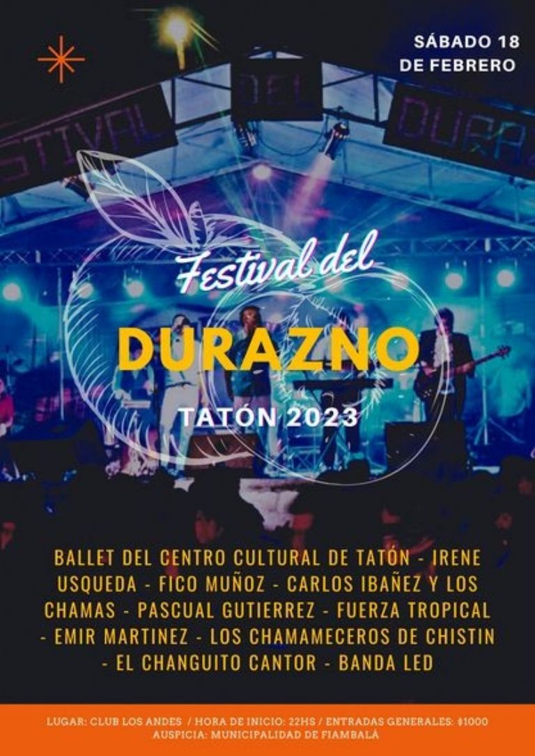 Cordialmente se hace la convocatoria para el próximo sábado 18 de febrero, disfrutar del festival más legendario de la región de Fiambalá. El Festival Regional del Durazno, es el segundo festival más antiguo del departamento Tinogasta y el primero del distrito de Fiambalá. Durará una sola noche, donde reunirá a los artistas más destacados del folklore popular de la región de la "Herradura", y otros pueblos del departamento, como así también de nuestra Capital. Será una verdadera fiesta de la cultura regional y uno de los pocos festivales que se llevarán a cabo este año, con artistas en vivo, danzas folklóricas, comidas regionales, patio criollo y al finalizar, gran bailanta popular.