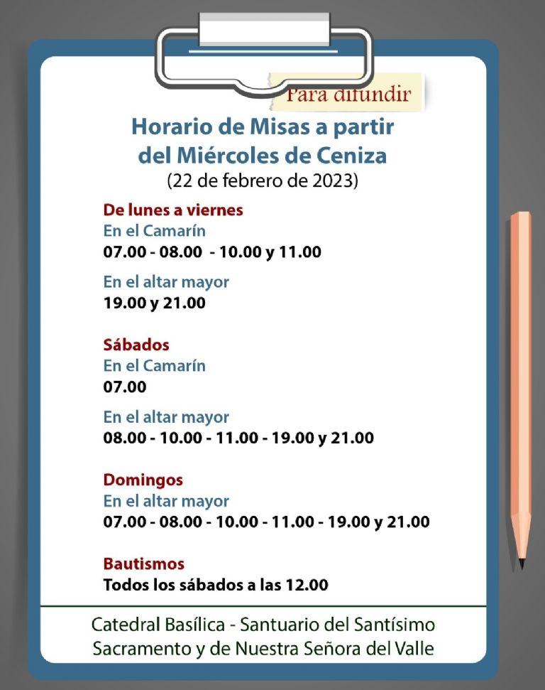 7:00, 8:00, 10:00, 11:00, 19:00 y 21:00, en el Altar Mayor.