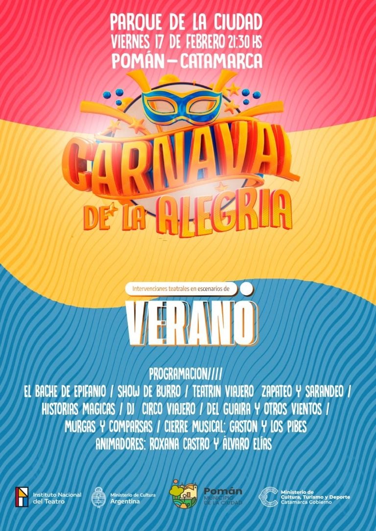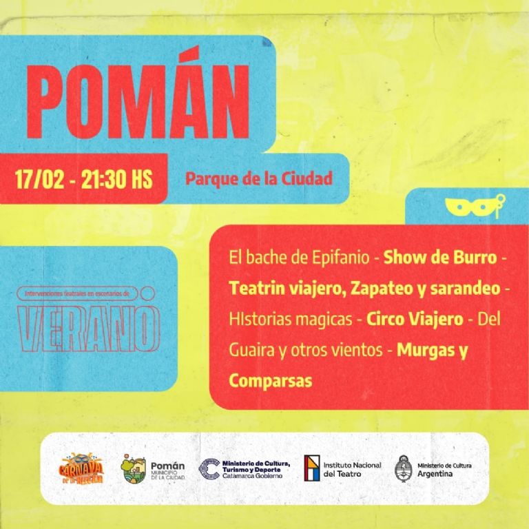 La representación en Catamarca del Instituto Nacional del Teatro (INT) en cogestión con la Secretaría de Gestión Cultural del Ministerio de Cultura, Turismo y Deporte de la provincia y la Municipalidad de Pomán presentan el ciclo "Intervenciones Teatrales en Escenarios de Verano".