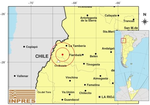 Epicentro: 254 km al NO de La Rioja; 289 km al O de San F. Del Valle De Catamarca; 44 km al SO de La Tambería -27.684 (lat) -68.549 (long)