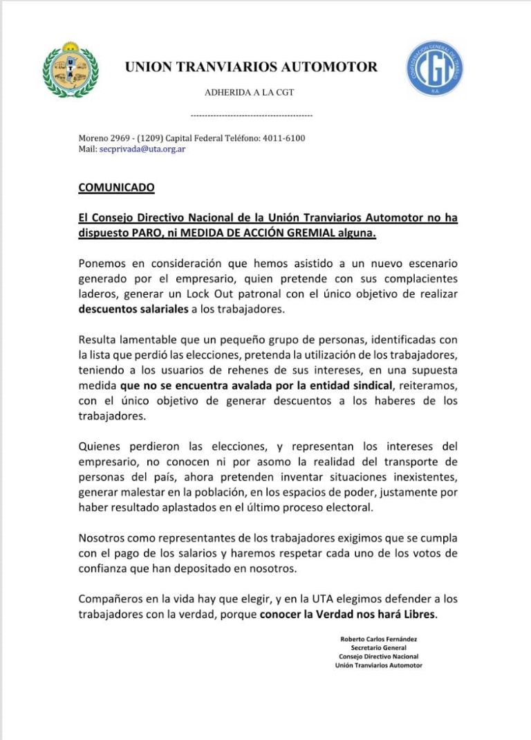 Resulta lamentable que un pequeño grupo de personas, identificadas con la lista que perdió las elecciones, pretenda la utilización de los trabajadores, teniendo a los usuarios de rehenes de sus intereses, en una supuesta medida que no se encuentra avalada por la entidad sindical, reiteramos, con el único objetivo de generar descuentos a los haberes de los trabajadores.