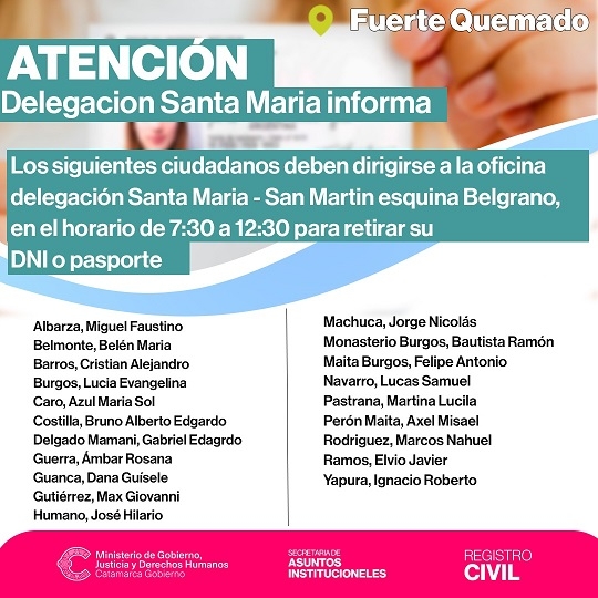 El Registro Civil Catamarca convoca a los ciudadanos nombrados del siguiente listado, domiciliados en Fuerte Quemado, Santa María, a dirigirse a la oficina local del Registro Civil, sito en San Martin esquina Belgrano, a retirar su DNI o Pasaporte.
