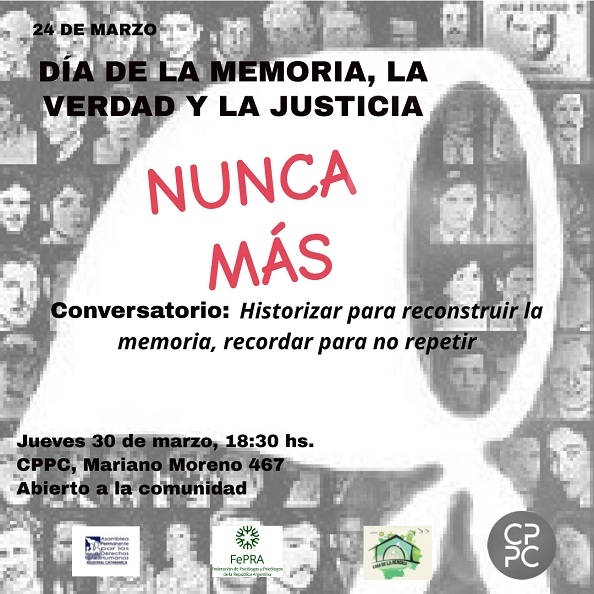 Acompañan: Casa de la Memoria, Asamblea Permanente por los Derechos Humanos, Federación de Psicólogos y Psicólogas de la República Argentina (FePRA).