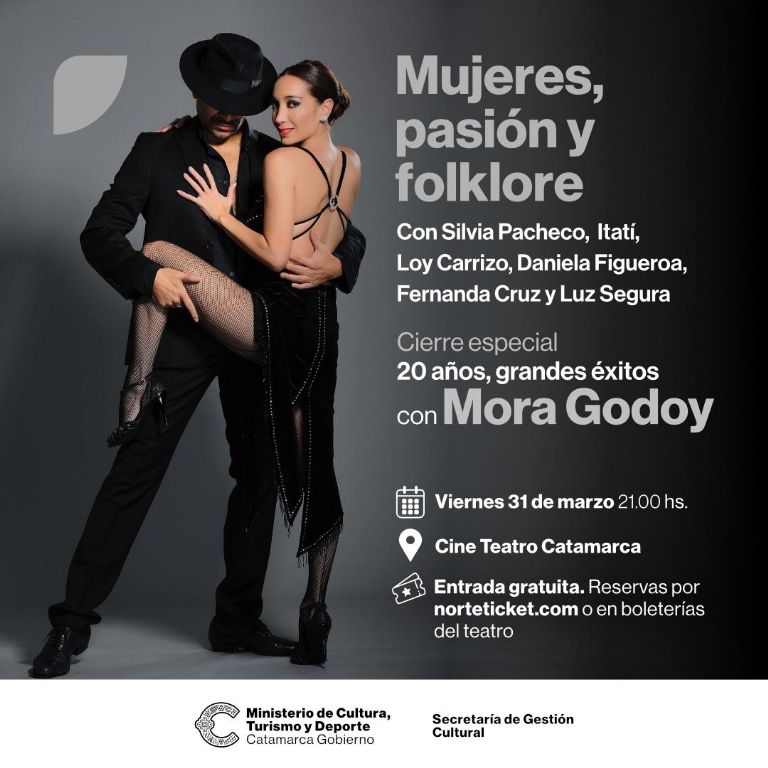 “Mujeres, pasión y folklore” es el nombre del espectáculo de música popular argentina, con voces femeninas de la provincia de Catamarca que se pondrá en escena en la primera parte de la velada, mientras que la segunda parte contará con la presentación especial de la bailarina y coreógrafa Mora Godoy, con el espectáculo “20 años, grandes éxitos”.