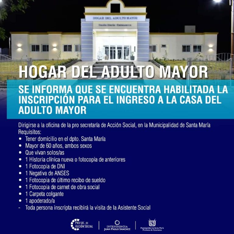 Los adultos que deseen inscribirse en el Hogar deberán acercarse a la oficina de prosecretaría de Acción Social, en la Municipalidad de Santa María.