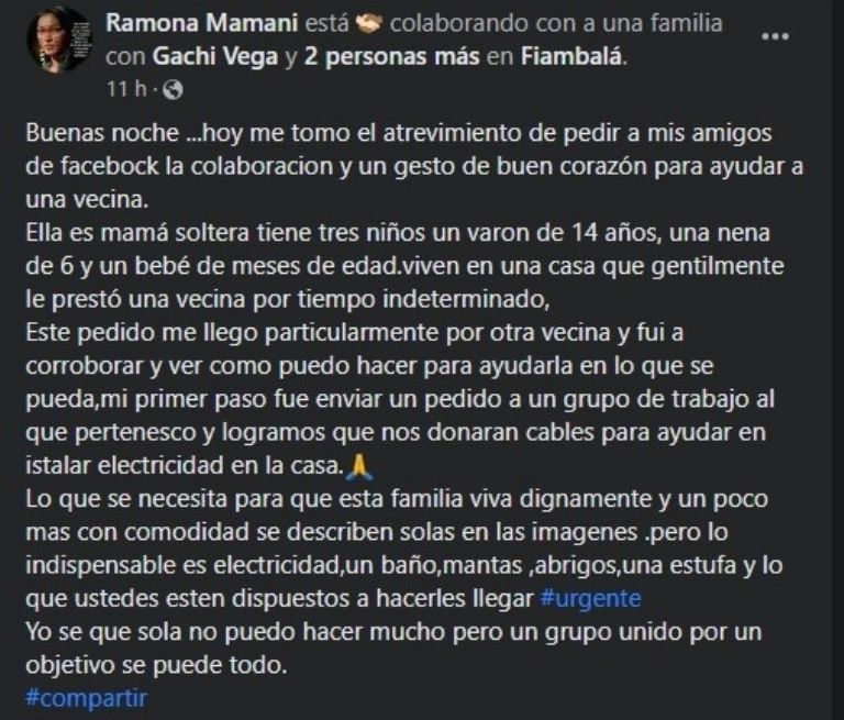 "Buenas noches... hoy me tomo el atrevimiento de pedir a mis amigos de facebook la colaboracion y un gesto de buen corazón para ayudar a una vecina.”, así empeza el pedido de ayuda de una vecina solidaria.