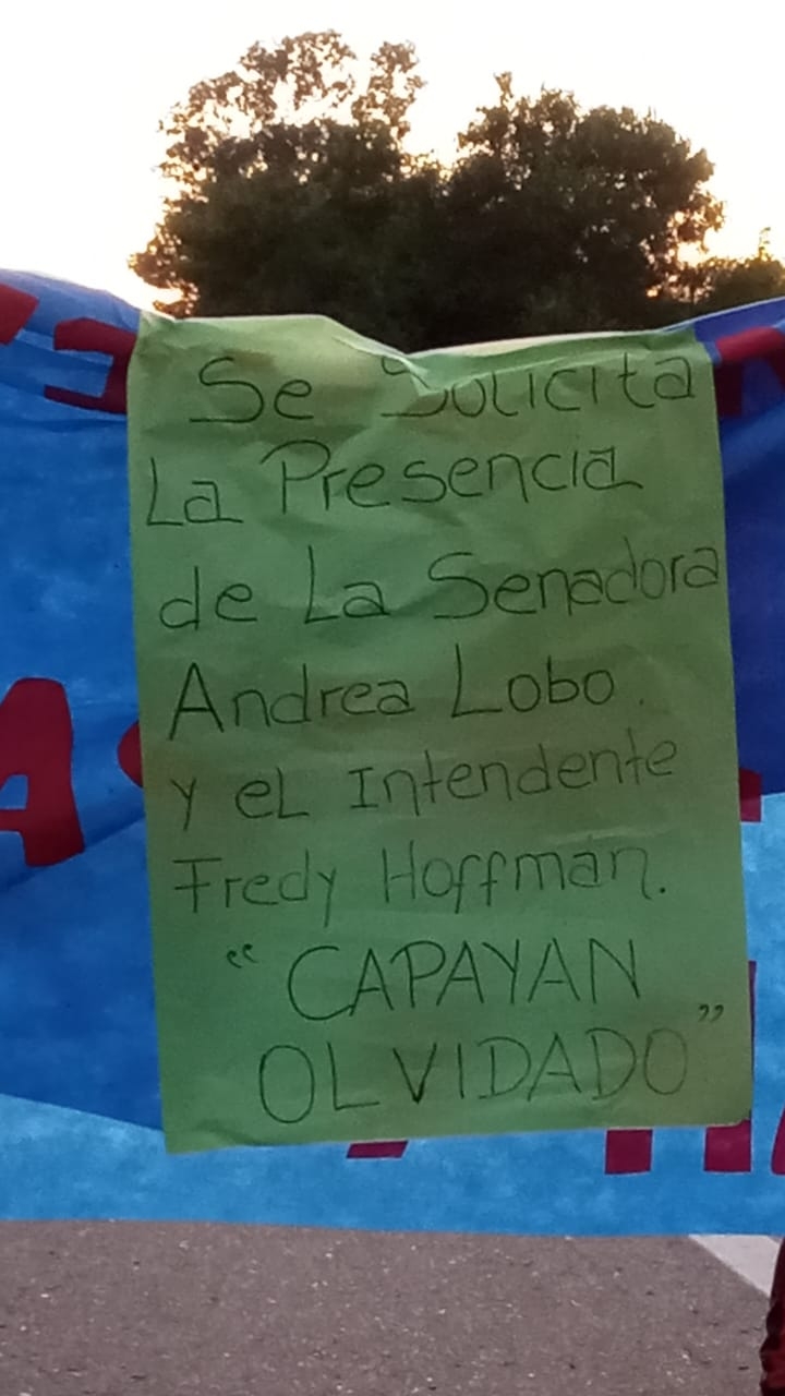 Las pancartas aluden a las ausencias del intendente municipal Alfredo Hoffman y a la senadora departamental Andrea Lobo en realizar las gestiones para mejorar las condiciones de vida de los capayenses. También piden que den la cara y se hagan presentes en la manifestación.