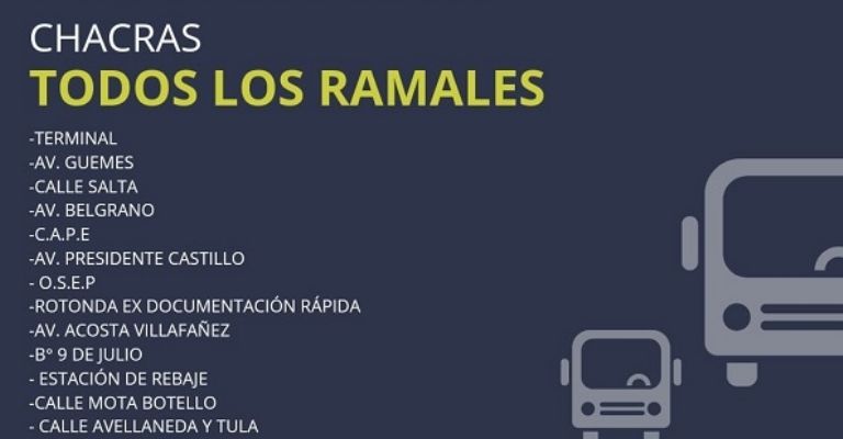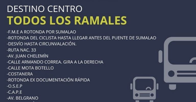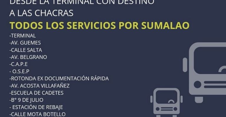La empresa 25 de agosto informó que el recorrido desde las Chacras hasta la Terminal de Ómnibus, en todos sus ramales, será el siguiente: antes del puente de Sumalao, desvío hasta Circunvalación, Ruta Nacional N°33, Av. Juan Chelemín, calle Armando Correa, calle Mota Botello, al salir por Costanera continúa su recorrido habitual.