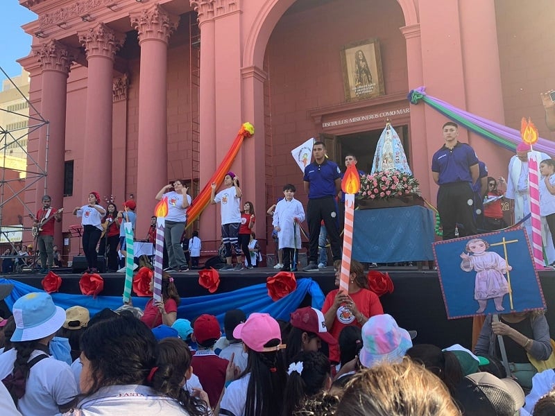 En el Paseo de la Fe, frente a la Catedral Basílica y Santuario mariano disfrutaron de las canciones y los bailes de la animación, a cargo del equipo de la Pastoral de la Niñez.