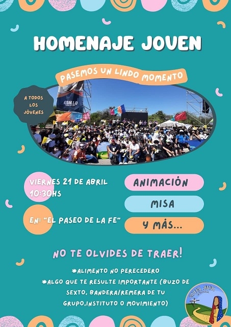 Los organizadores invitan a los estudiantes secundarios de las escuelas públicas y privadas, particularmente de 5° y 6° años, a participar de este homenaje en grupo y llevar distintivo, confeccionar folletos y souvenirs para compartir, realizar signos para ofrecer, llevar alimentos no perecederos y contagiar amor y alegría.
