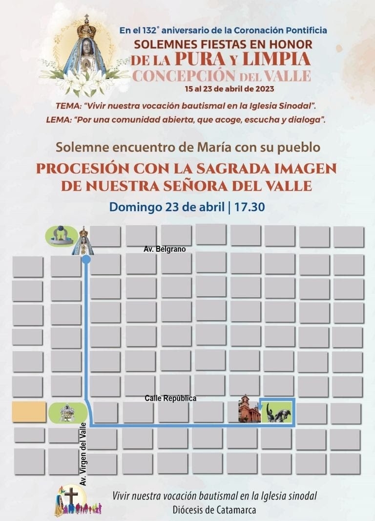 La Diócesis de Catamarca hizo público el recorrido que tendrá la procesión que se celebrará mañana, domingo, a las 17:30 horas, con la sagrada imagen de nuestra señora del valle.