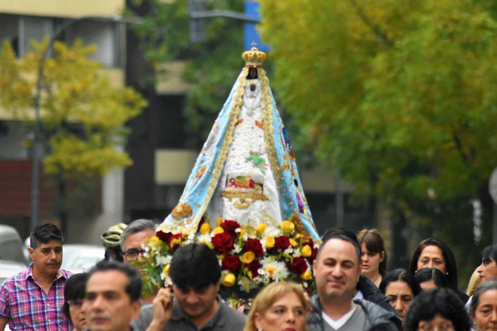 Cabe señalar que la Imagen lucía especialmente el Manto bordado a mano por Rina del Valle Quiroga, laica consagrada, con el relato de los Misterios Gozosos del Santo Rosario.