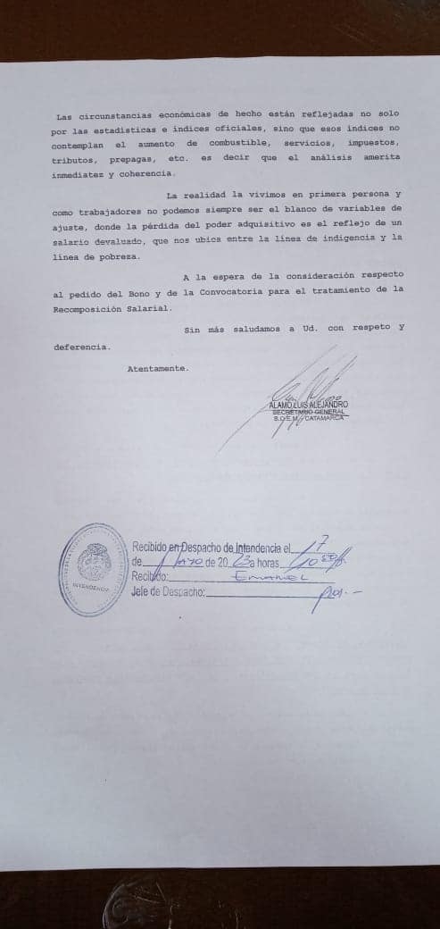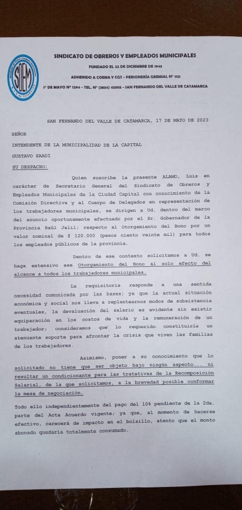 Respecto del bono solicitan que sea igual que el otorgado por el Gobernador Raúl Jalil a la administración pública, de $120.000.