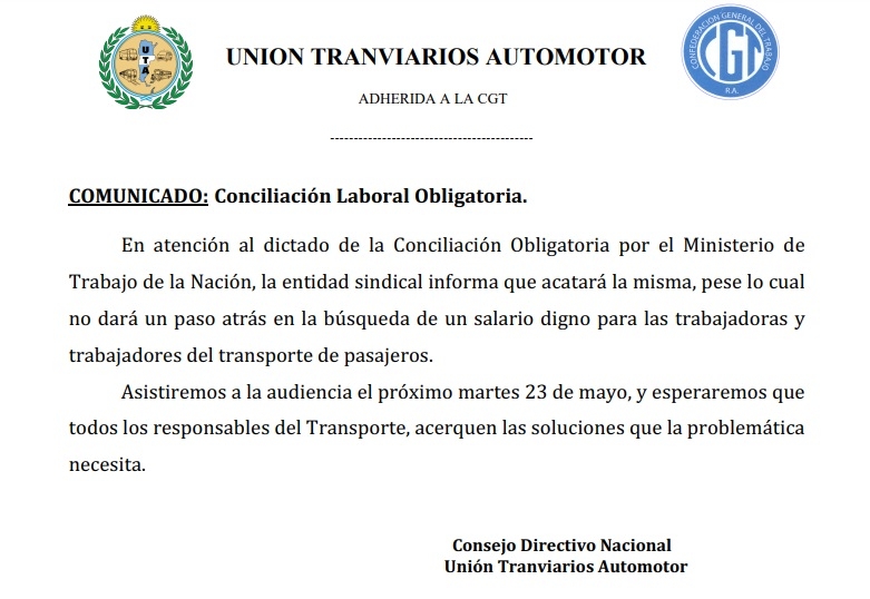 La audiencia de conciliación será el próximo 23 de mayo, instancia en la cual las partes intentarán llegar a un acuerdo en el marco del reclamo de aumento salarial de los choferes del área AMBA y del interior del Pais.