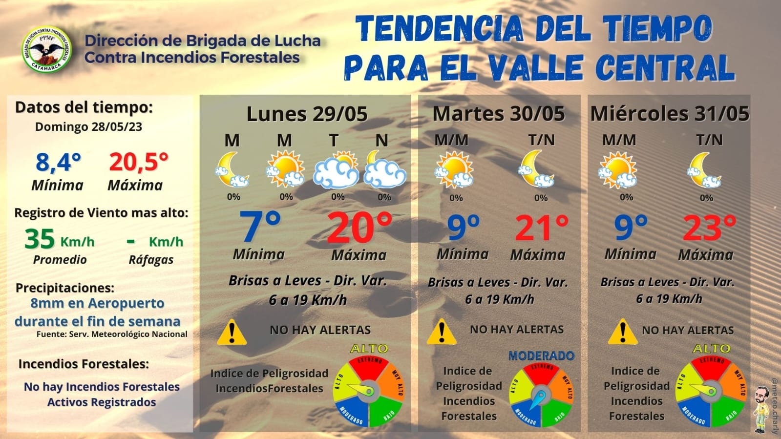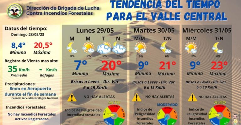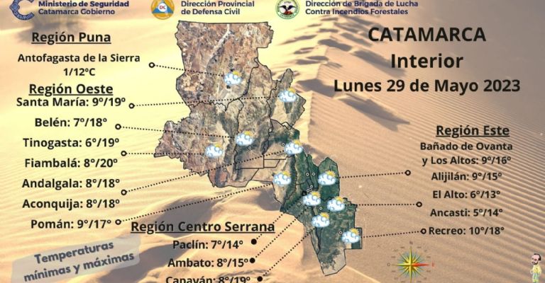HOY: El día de hoy tendremos el cielo ALGO NUBLADO A PARCIALMENTE NUBLADO, la temperatura máxima estaría alcanzando los 20°C y solo 7°C de Mínima, con vientos entre BRISAS A LEVES en direcciones variables, no hay probabilidad de precipitaciones.