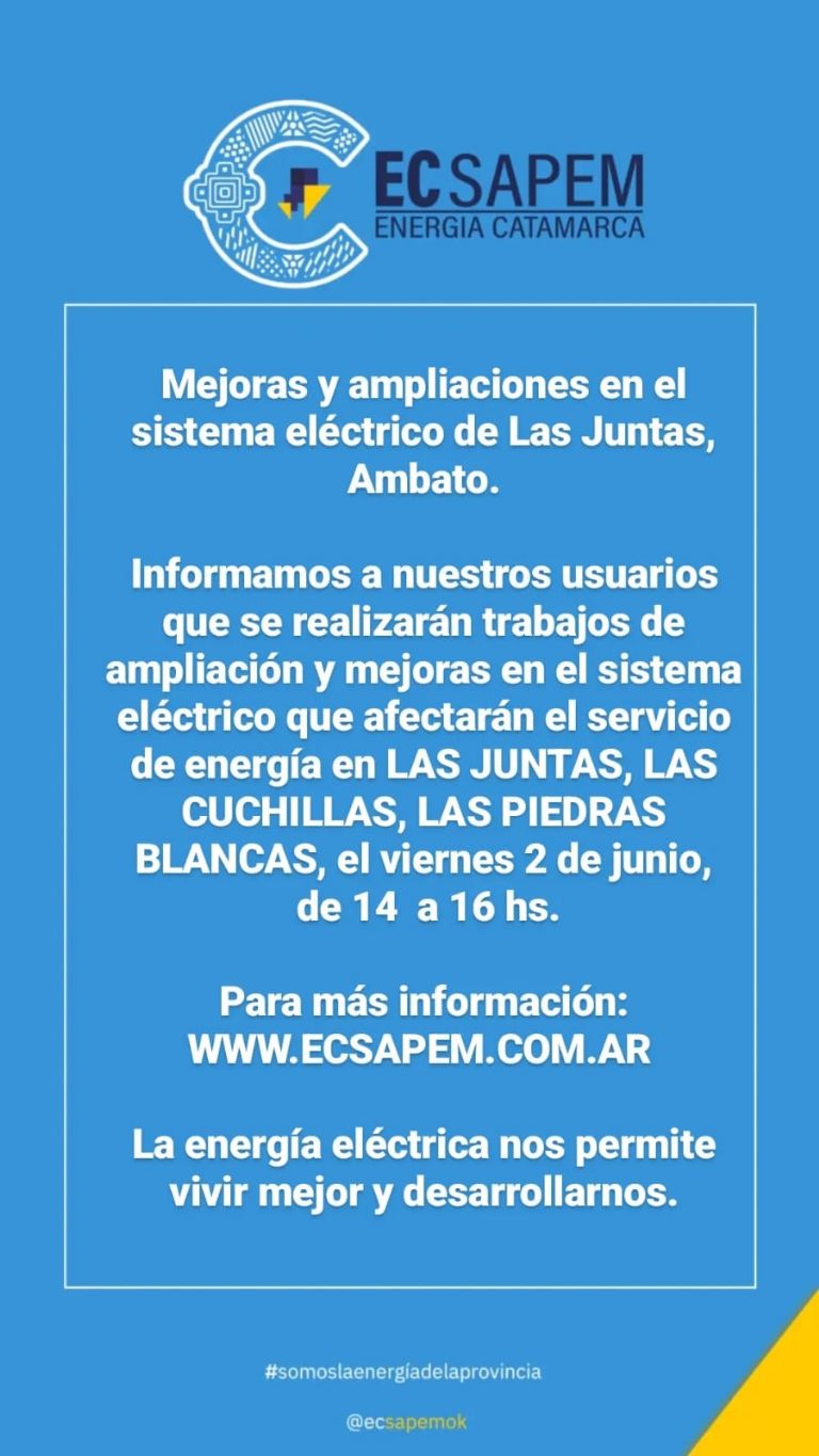 Informamos a nuestros usuarios que se realizarán trabajos de ampliación y mejoras en el sistema eléctrico que afectarán el servicio de energía en LAS JUNTAS, LAS CUCHILLAS, LAS PIEDRAS BLANCAS, el viernes 2 de junio, de 14 a 16 hs.