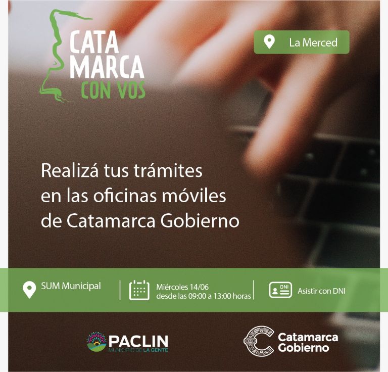 Este Miércoles 14 de junio, los móviles del programa “Catamarca con Vos” llegan a la localidad de La Merced, departamento Paclín, para poner a disposición de los vecinos trámites y servicios. El operativo estará en el SUM Municipal de esa localidad, en el horario de 09:00 a 13:00 horas.