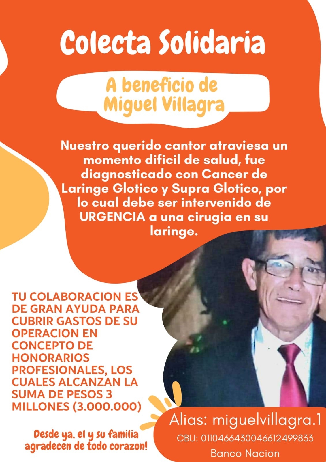 Miguel Villagra, un conocido folclorista de Valle Viejo, se encuentra en una delicado estado de salud y necesita solventar una costosa operación en un centro de alta complejidad. Sus familiares iniciaron una campaña solidaria para recaudar fondos.