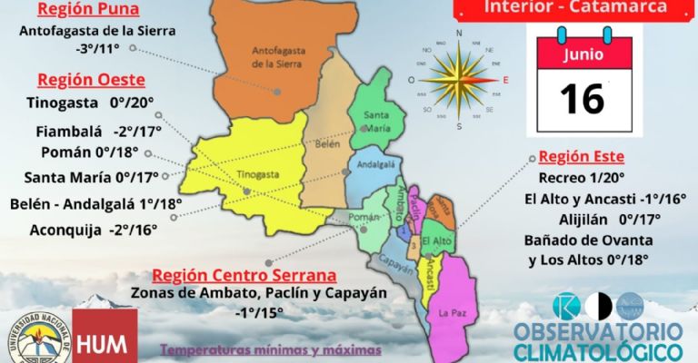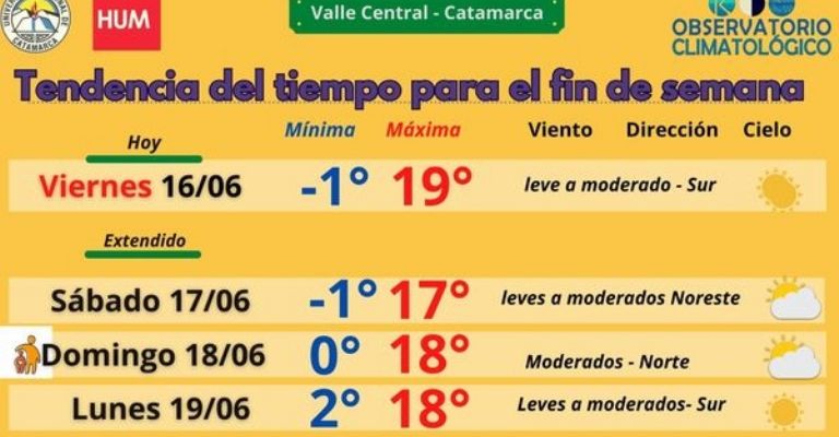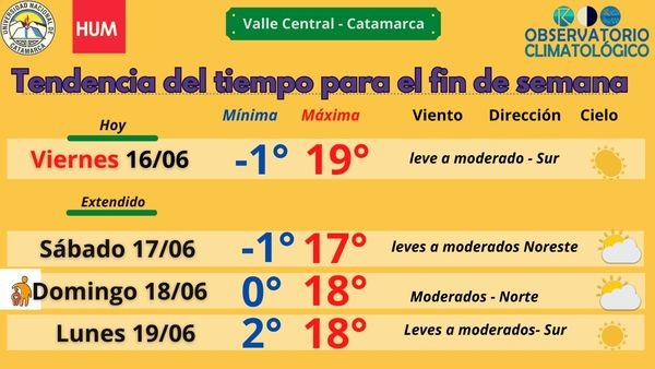 El Servicio climatológico de la Universidad Nacional de Catamarca emitió el parte de prensa para este fin de semana. En la noche y madrugada habrá temperaturas mínimas bajo cero aunque durante el día se mantendrán en la media.