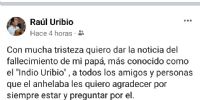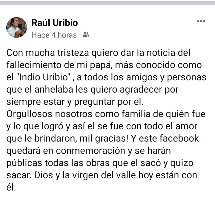 Sus familiares hicieron público su deceso por las redes sociales, trasmitiendo la tristeza por su partida, aunque con el reconfortante mensaje de que “Dios y la Virgen del Valle hoy están con él”.