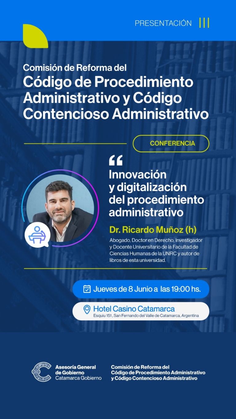 Este jueves, 8 de junio, a las 19, se realizará la presentación, en el Hotel Casino. En la oportunidad se llevará a cabo la conferencia “Innovación y digitalización del proceso administrativo”. La disertación estará a cargo del Dr. Ricardo Muñoz (h), doctor en Derecho, investigador, docente y autor de libros universitarios.