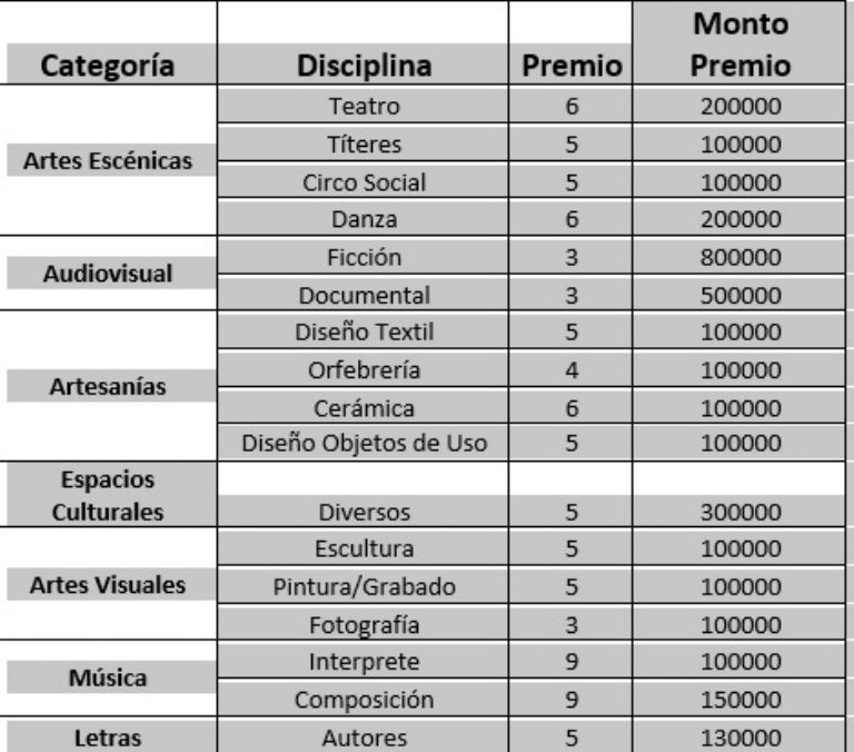 A continuación se detallan las categorías con sus respectivas disciplinas, la cantidad y los montos asignados como premios;