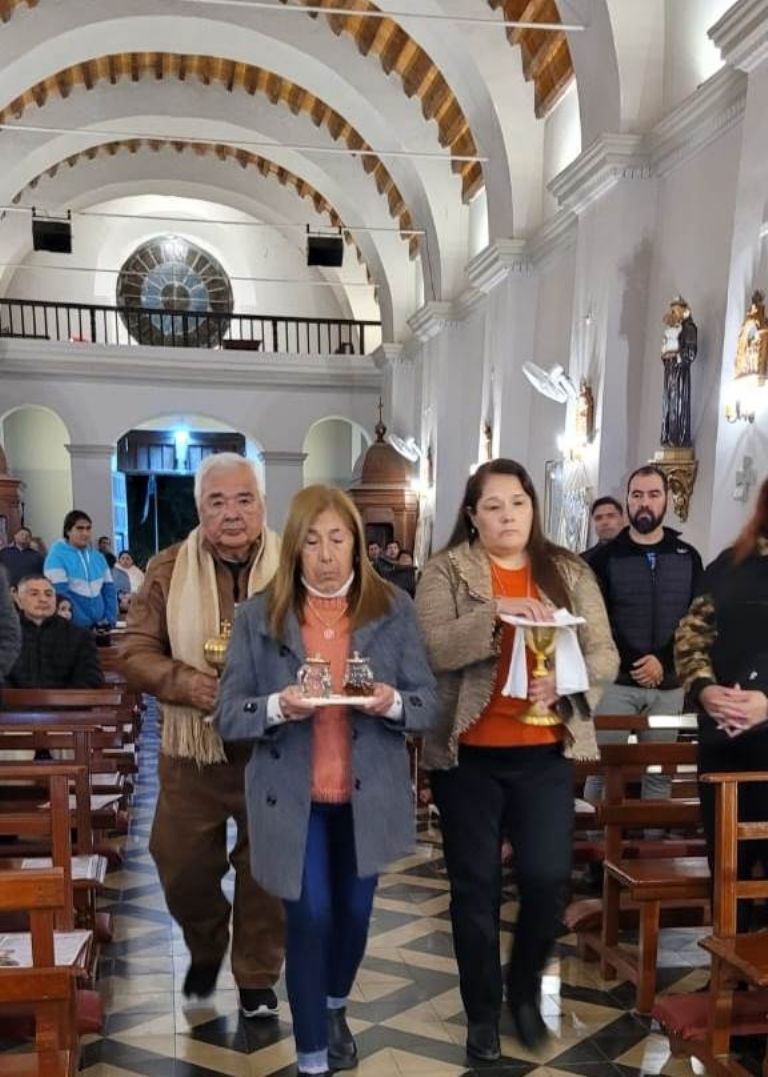 La ceremonia litúrgica que se realizó en la tarde del jueves 13, fue presidida por el párroco, padre Carlos Robledo, y participaron especialmente las autoras de la prenda, la reconocida telera oriunda de la tierra del Beato Mamerto Esquiú Guillermina Zárate y sus hijas Mónica y Andrea Aguilar, quienes realizaron esta ofrenda a nuestro querido Beato.