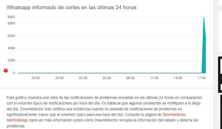 Alrededor de las 17 horas, se cayó nuevamente WhatsApp. Los usuarios comenzaron a reportar fallas para enviar y recibir mensajes, según indico el sitio Downdetector, que mide el volúmen de reportes de fallas en diferentes aplicaciones, contrastándolo con el promedio para el día.