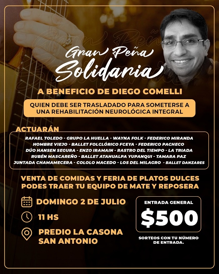 La peña, destinada a recaudar fondos para su tratamiento, cuenta con una importante cartelera artística integrada por Rafael Toledo, La Huella, Huayna Folk, Federico Miranda, Hombre Viejo, Ballet Folklórico FCEyA, Dúo Hansen Segura, Enzo Iramain, Rastro del Tiempo, Rubén Mascareño, La Triada, Ballet Atahualpa Yupanqui, Tamara Paz, Juntada Chamamecera, Ballet Danzares, Los del Milagro y El Bomba Contreras, quienes se sumaron desinteresadamente para acompañar este día de solidaridad.