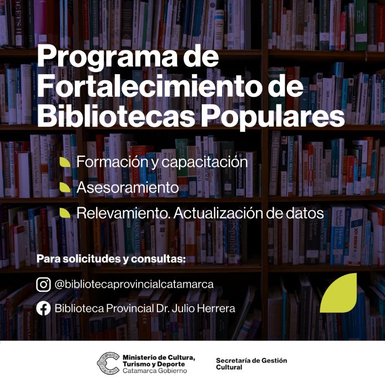 Por más información y solicitudes para el Programa de Fortalecimiento de Bibliotecas Populares, comunicarse vía Facebook: Biblioteca Provincial Dr. Julio Herrera o por Instagram: @bibliotecaprovincialcatamarca.